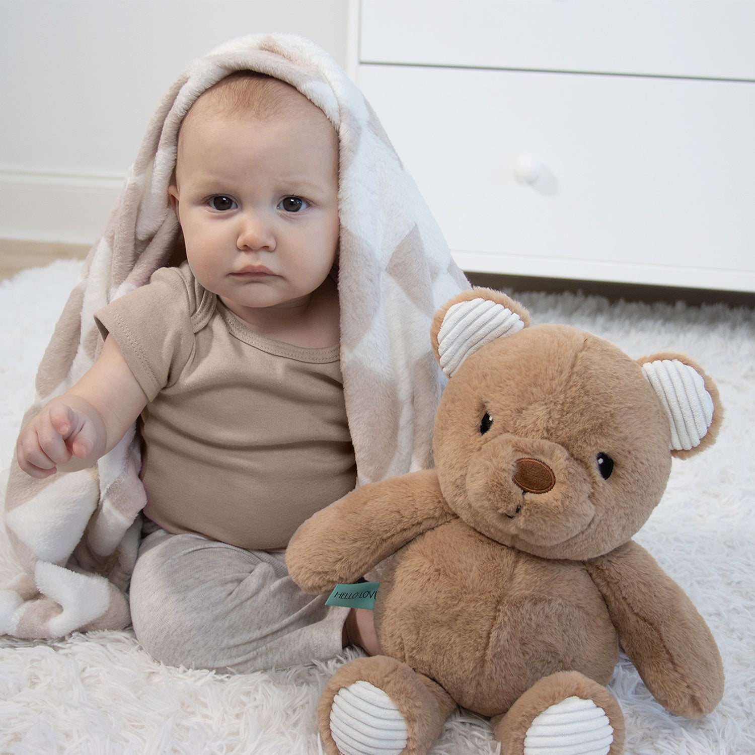 Unit price perWrap your loved one in warmth and comfort this holiday season with our Teddy Bear and Blanket Gift Set. This adorable duo pairs a super-soft plush bear with the cozy comfort of a 30x40 velour blanket in a soft tan check pattern designed for snuggles, naps, and travel. Cuddly Benny is the perfect plush friend, his gentle expression and huggable soft texture make it an instant favorite for a cozy cuddle. This plushie bear stuffed animal offers emotional support and companionship, while the blanket provides soothing warmth — together creating a sense of calm and security. Thoughtfully designed and irresistibly sweet, this handsome duo makes a heartwarming gift. Whether you’re searching for the perfect Christmas gift, birthday gift, baby shower gift for newborns, or any special occasion, this keepsake set delivers both comfort and style. Crafted from durable, baby-safe materials, it’s made to withstand years of hugs and love. Give the gift of softness, love, and timeless charm this season with a teddy bear and blanket set that brings joy to both babies, children and parents alike.