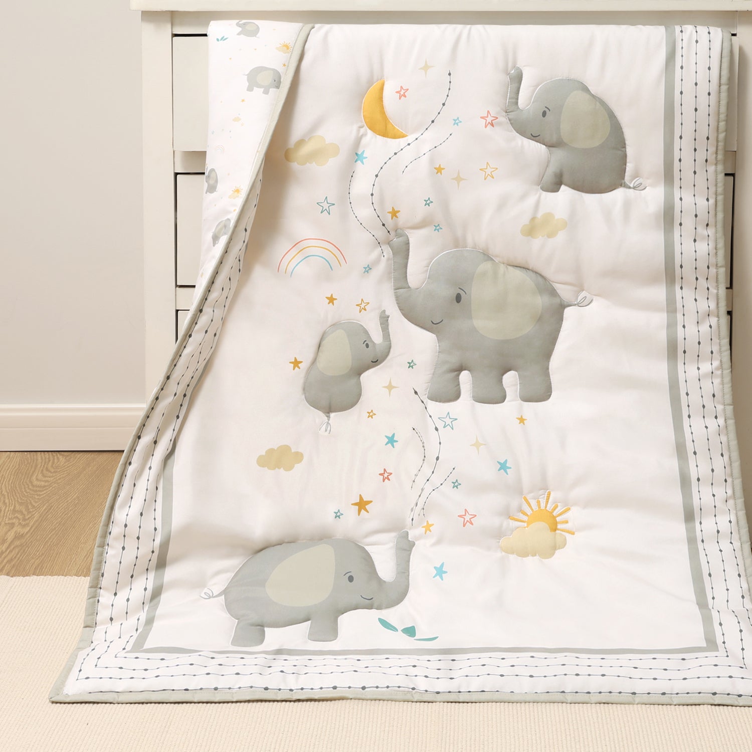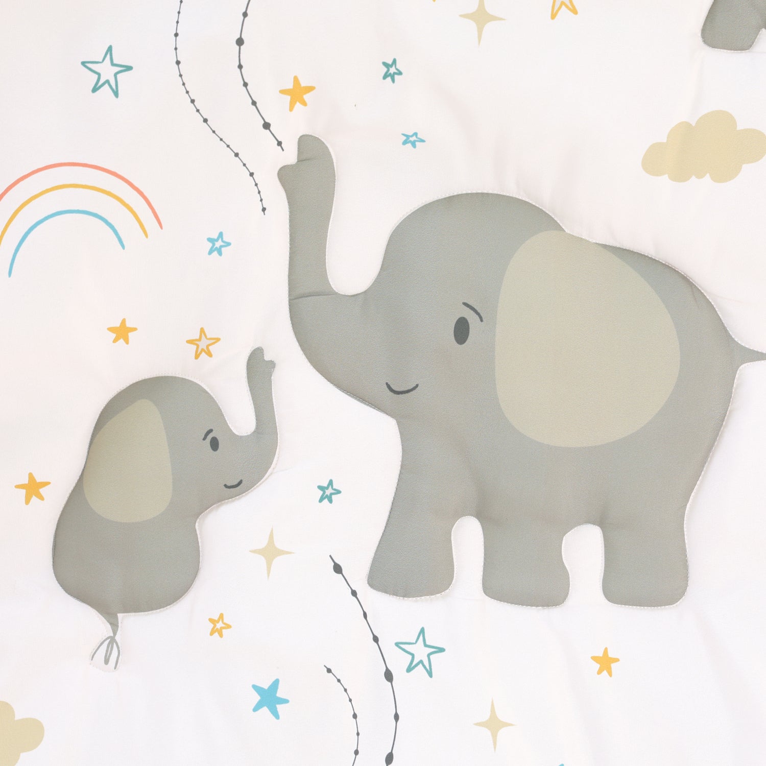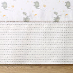 Unit price perLet your little one drift off to dreamland under the stars with our Elephant Whimsy 3-piece crib bedding set. Soft taupe-gray elephants play among stars, moons, and rainbows, creating a gentle, celestial-inspired sleep space. Crafted in soothing ivory and cream tones, the set offers a timeless, gender-neutral palette that complements both whimsical and modern safari-inspired décor. The 3-piece bed set includes a whimsical elephant crib sheet, a cozy quilt, and a coordinating bed skirt designed for both comfort and style. Breathable, soft fabrics create a safe, cozy environment, while the playful design add just the right touch of charm. This crib set is perfect for any safari-inspired space, this set also makes a thoughtful baby shower gift that’s sure to be cherished.