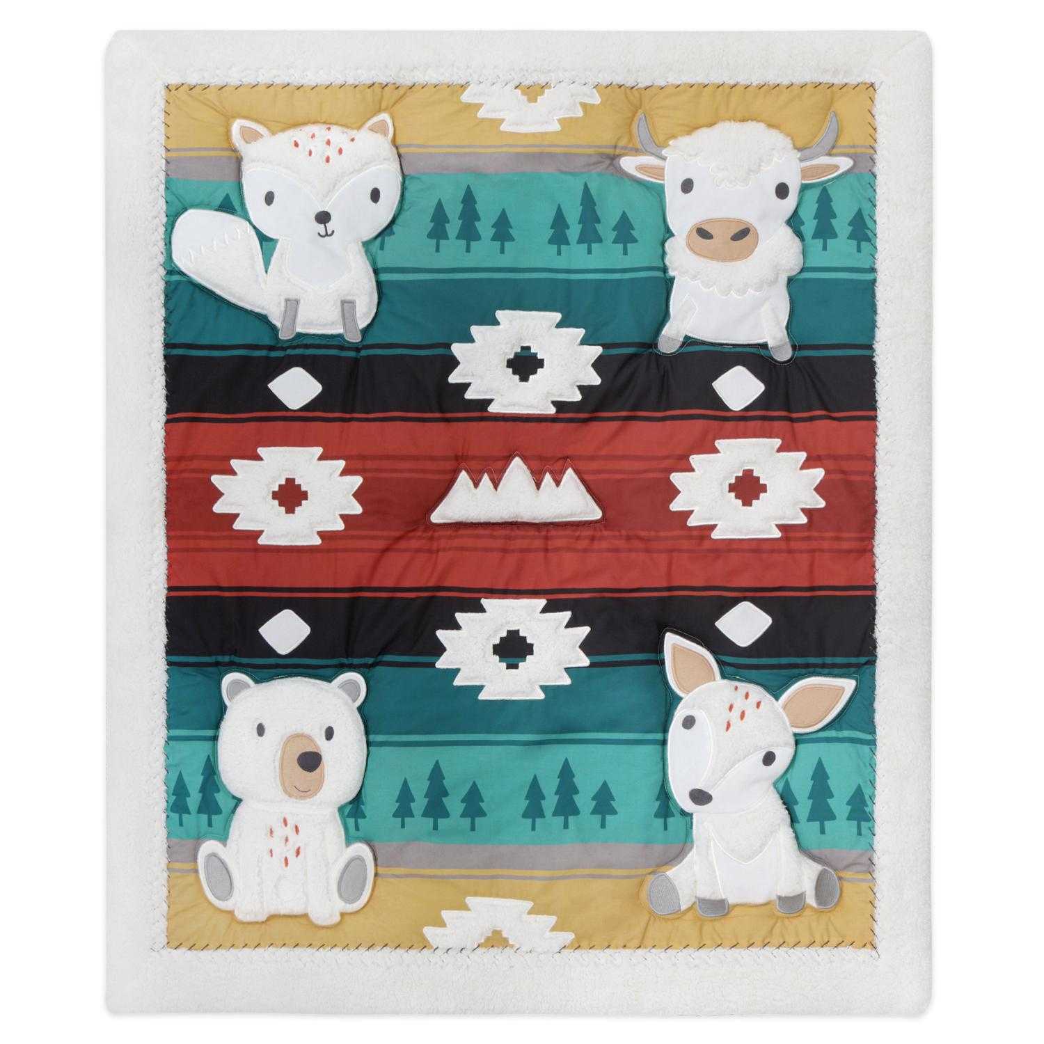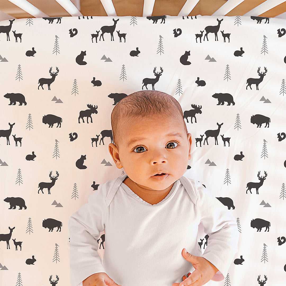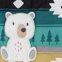 This Woodscape crib bedding set will be the perfect addition to any nursery. A reversible white crib quilt features friendly yellow and grey woodland animals with grey and green geometric accents. Two sets of crib sheets feature yellow and grey woodland critters patterns, one on a white background with critters sprinkled around and the other on a light grey background with larger yellow and grey critters. A velour blanket with bear silhouettes in shades of grey and yellow on a white background will add a cozy touch to this set. Finally, a tonal grey bed skirt with a darker grey geometric pattern completes this lovely look. Combine this set with our other woodland-themed nursery décor, crib mobiles, and sheet sets to complete your Woodscape bedroom.