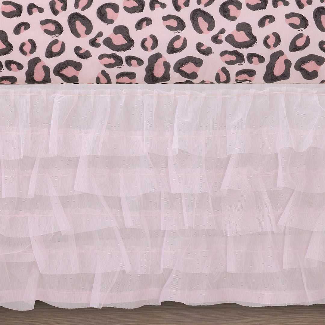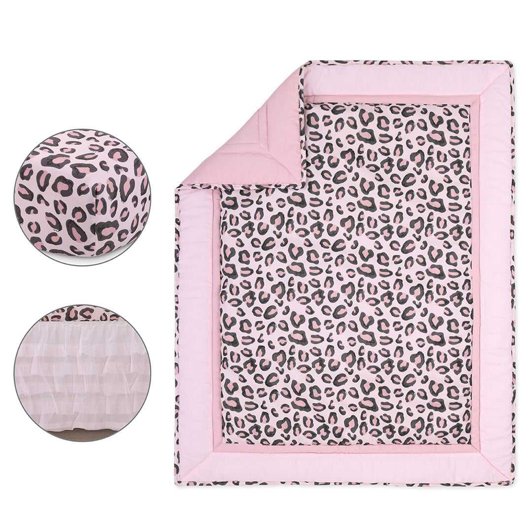 Our Pink Floral 3 Piece Microfiber Crib Bedding Set fits well in any baby girl's room with its color palette of shades of pink, grey, and white, with a sweet and sophisticated floral and polka dot motif. Quilt features a printed center panel of watercolor-inspired roses, with a border in a sweet and simple polka dot, pieced with a neat and clean grey border and stitch-through quilting details. Fitted sheet ties back to the quilt with the same watercolor floral print, and the 3-sided dust ruffle matches the polka dot in the quilt and finishes off this set perfectly! Microfiber fabric is touchable soft and the easiest of care. Set includes quilt, fitted sheet, and 3-sided dust ruffle.