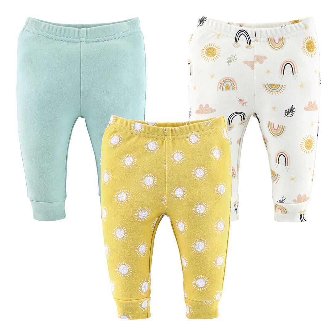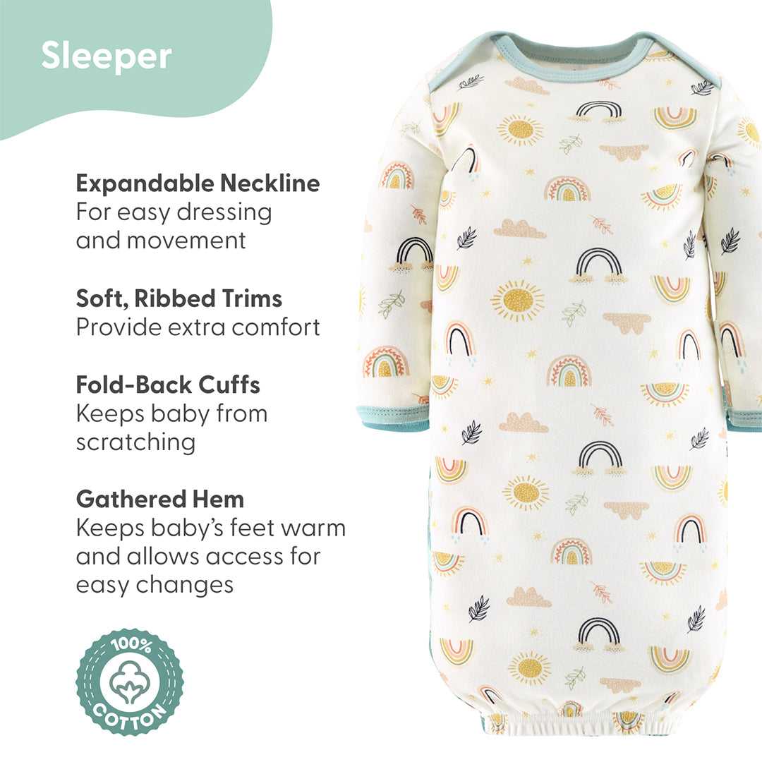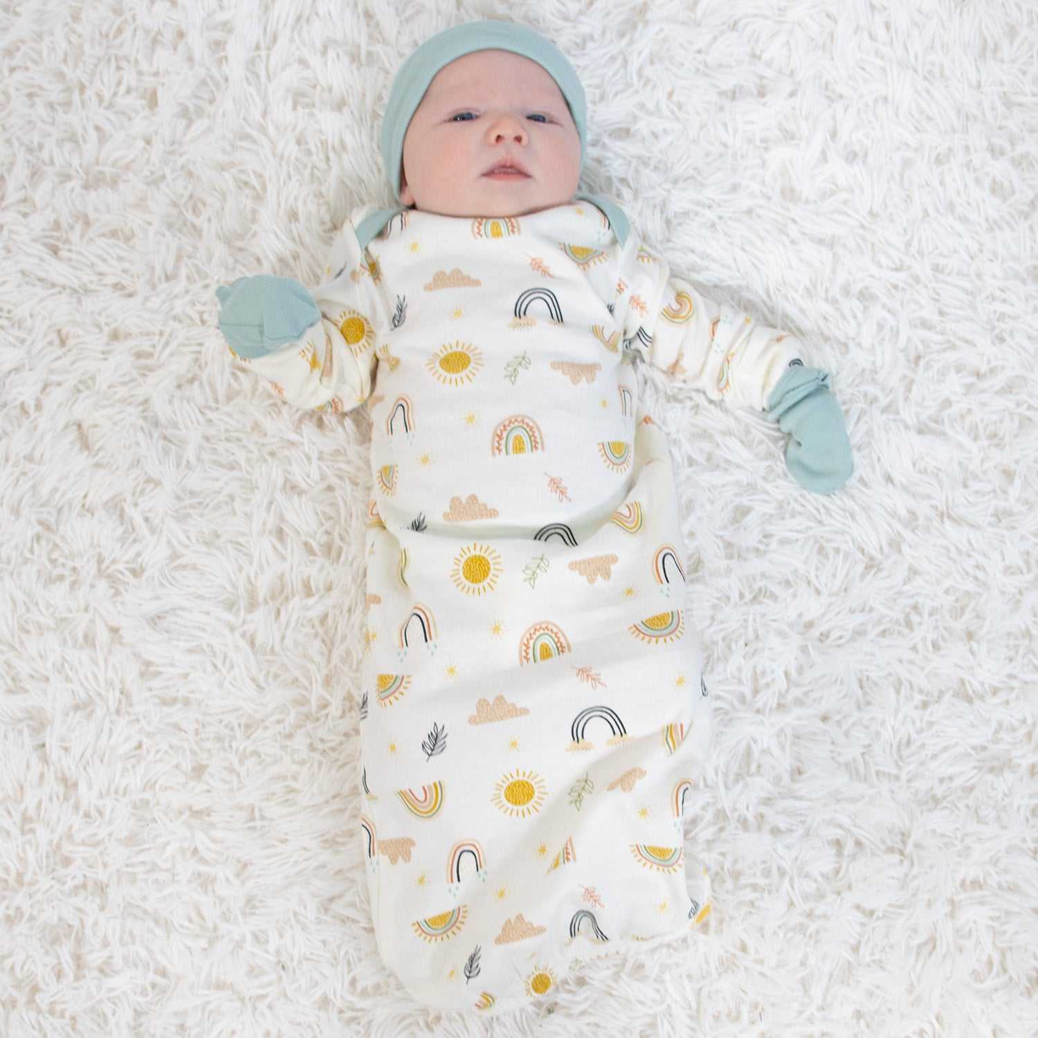 Give your early riser a thoughtfully curated gift with our Sunny Side Up 16 Piece Layette set. This charming cloud, sun and rainbow themed bundle includes all the essential outfit accessories for your newborn. Our assortment includes 3 short sleeved bodysuits, 3 hats, 3 pairs of pants, 3 pairs of scratch mittens, 3 pairs of socks, and a sleep gown. Mix and match between bright white, golden yellow, and sage green pieces with a whimsical sun and rainbow print to create various layered looks. This set of must haves makes the perfect baby shower gift.