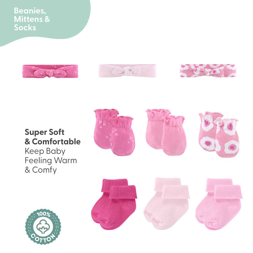 Our Pretty in Pink Newborn Baby Layette Gift Set offers 16 essential pieces crafted from ultra-soft, 100% cotton fabrics, providing gentle comfort for your baby’s delicate skin. Designed to keep your little one cozy through every season, this set includes 3 short-sleeve bodysuits, 3 pairs of pants, a sleep sack, a wearable blanket with a zipper and snap tab, 3 hats, 3 pairs of mittens, and 3 pairs of socks. Our newborn baby clothes are designed for maximum comfort, making this baby essentials set a practical and stylish addition to your baby girl’s wardrobe.