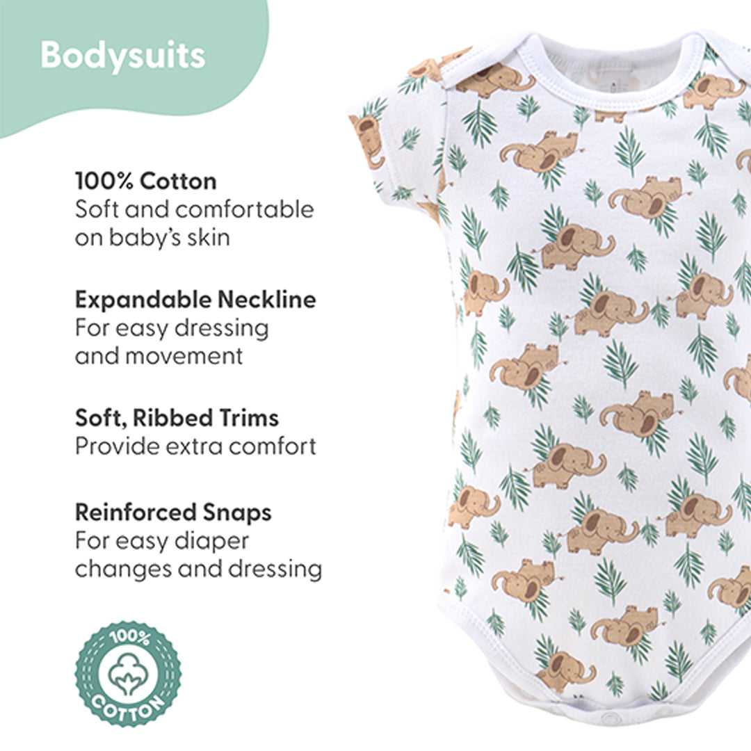Featuring sweet elephant and boho jungle leaf assortments, this Wild Jungle layette set allows your baby to showcase a cool, laid-back style from the very start. This baby clothing set makes an excellent baby shower gift, offering the essentials every newborn needs with a fun, modern twist. Plus, all the pieces are machine washable, ensuring that busy parents can easily clean and maintain these durable, soft items wash after wash. Combining comfort, practicality, and style, this new born clothes set is a joyful gift for any new parent. This baby boy or girl set is perfect as a unisex new baby gifts. Whether you are looking for a baby shower gift, doing a baby registry search, or need additions to a baby gift basket, they are sure to be appreciated by new parents as gender neutral baby essentials.