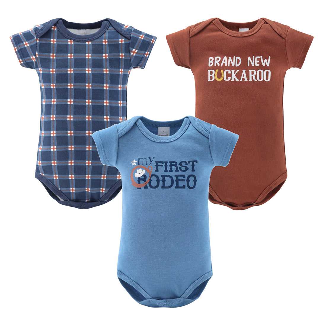 This layette gift set includes the perfect assortment of newborn baby clothing! This adorable rodeo & western-inspired bundle includes all the essential outfit accessories for a newborn. The solid pieces are perfect to mix and match with the plaid and cowboy bear patterned pieces to create various layered looks. This adorable, must-have set makes a perfect shower gift for a new baby.