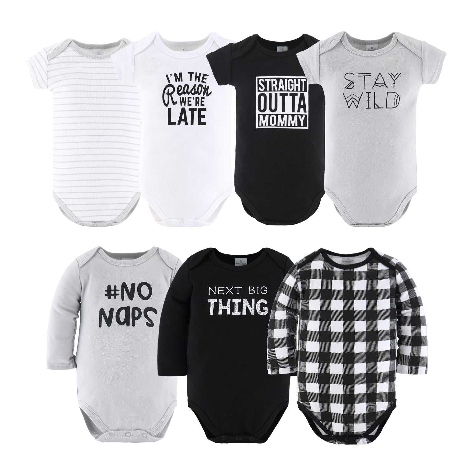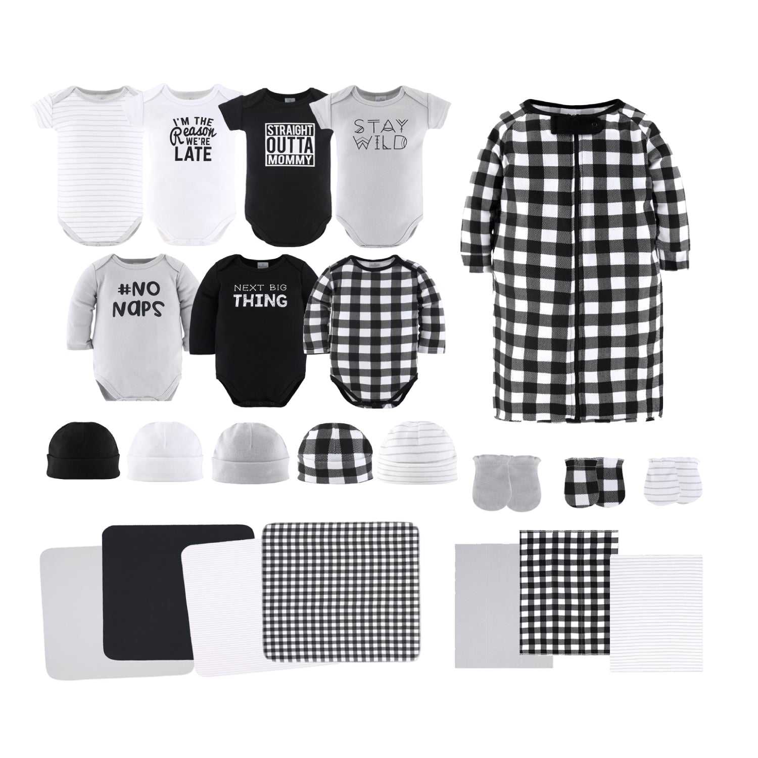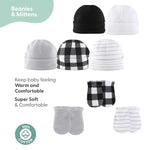 This must-have set of Black, White, Baby Layette Gift Set, 23 Piece makes a thoughtful and much appreciated baby shower gift. Made of soft 100% cotton, this 23 piece newborn baby gift set includes receiving blankets, burp cloths, beanies, mittens, long sleeve bodysuits, short sleeve bodysuits and a baby sleep sack – all in beautifully coordinated colors and patterns. Newborn baby clothing items include essential features to care for baby – expandable necklines, soft ribbed trim, reinforced snaps, soft ribbed cuffs and zipper pull guard. Newborn receiving blankets and baby burb cloths are super soft to comfort and keep baby warm and cozy. Machine wash and dry for easy care.