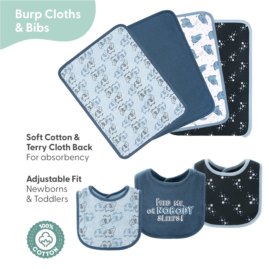 Featuring funny sayings, stars, and playful elephants, this Elephant Blue layette set allows your baby to showcase a cool, laid-back style from the very start. This 0-3 month baby clothing set makes an excellent baby shower gift, offering the essentials every newborn needs with a fun, modern twist. Plus, all the pieces are machine washable, ensuring that busy parents can easily clean and maintain these durable, soft items wash after wash. Combining comfort, practicality, and style, this new born clothes set is a joyful gift for any new parent. This baby boy set is perfect as a new baby boy gift. Whether you are looking for a baby shower gift, doing a baby registry search, or need additions to a baby gift basket, they are sure to be appreciated by new parents as baby boy essentials.