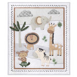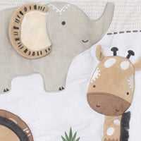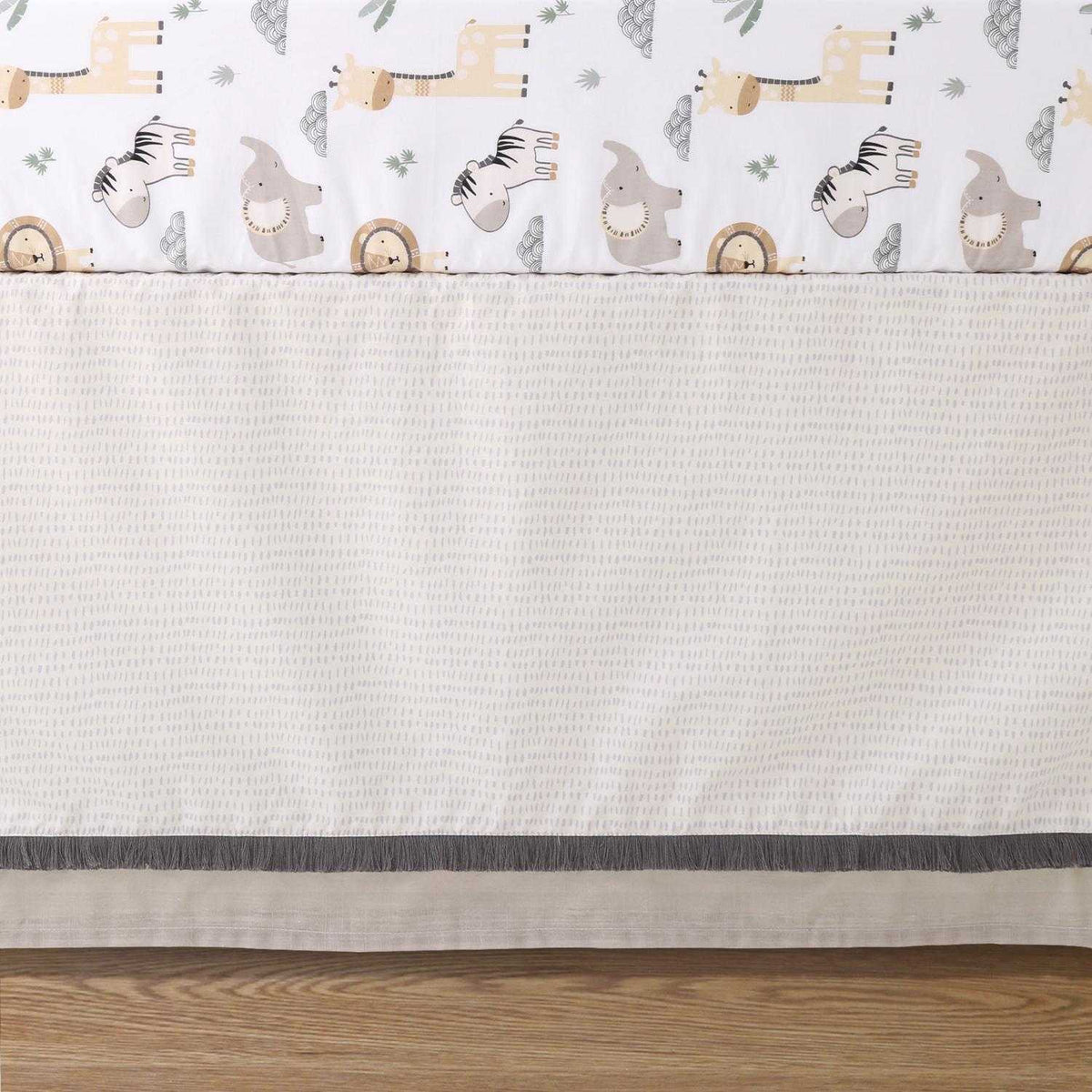 Safari Serenity 4 Piece Organic Cotton Baby Crib Bedding Set creates a friendly and cozy nursery space with its playful safari theme, featuring adorable lions, zebras, giraffes and monkeys. This set includes all the essentials you need for a complete and stylish nursery: two fitted crib sheets, a plush quilt, and a tailored 4-sided bed skirt with a generous 16" drop, offering a sophisticated and coordinated look that complements any nursery decor. Both fitted crib sheets are made from 100% organic cotton and are designed to fit standard crib mattresses snugly with all-around elastic. The organic cotton materials used throughout the set are gentle on your baby’s skin, providing a soft, breathable, and cozy environment for both newborns and toddlers. All pieces are machine-washable, and retain their softness and vibrant neutral tones even after multiple washes, ensuring long-lasting comfort and durability.