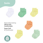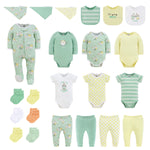 This complete baby layette set includes 1 long-sleeve footed sleeper, 3 long-sleeve bodysuits, 3 short-sleeve bodysuits, 4 pairs of pants, 6 pairs of socks, 3 terry feeding bibs, and 3 bandana bibs—covering all essential baby boy or baby girl newborn clothes from morning to bedtime. Crafted from 100% cotton for ultimate softness and breathability, each piece feels gentle against your baby's delicate skin.