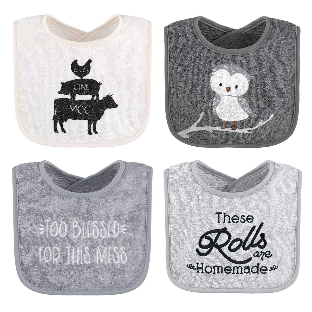 Adorable, absorbent and super soft 8-pack set of cotton bibs to protect baby's clothes from drooling, during feeding and while teething. Sure to make Mom and Dad smile, each unisex baby bib has a fun design in bold neutral grey, black and whites. Made of 100% cotton. Adjustable to fit newborns, infants and toddlers.