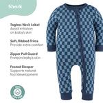 Unit price perMake an ocean-inspired splash with our Sharks 2-Pack Footless Sleepers. This dynamic duo pairs a playful navy, teal, and light blue tossed shark print with a tonal blue geometric design for a subtle yet stylish balance. The footless design supports natural development, allowing little feet to grow strong while encouraging crawling and walking. Crafted from 100% premium cotton, these baby boy pajamas are breathable, soft against sensitive skin, and built to last through countless washes. The convenient full-length zipper makes diaper changes quick and stress-free, while the zipper guard protects delicate chins. Perfect for both sleep and play, these rompers transition seamlessly from naptime to playtime. These baby boy clothing sets are an essential addition to any baby boy's wardrobe – comfortable for sleeping, practical for playing, and adorable for everyday wear. Whether you're shopping for your own little explorer or seeking the perfect baby shower gift, these durable, comfortable sleepers are sure to delight. Summer, Fall, Winter or Spring, these are the versatile pajamas growing families love.