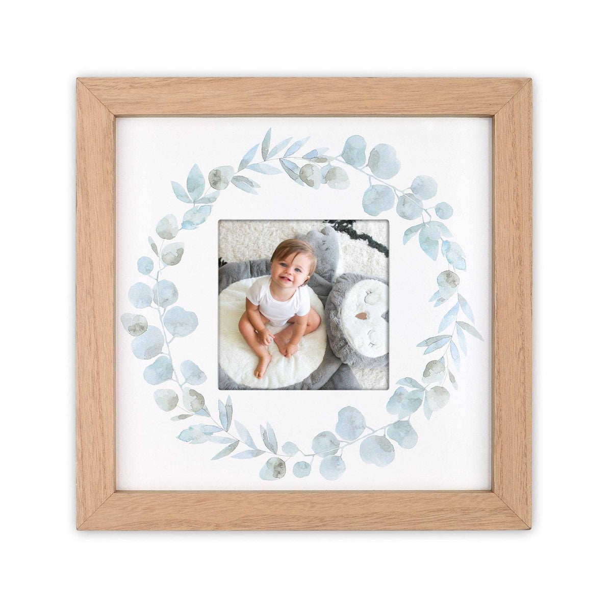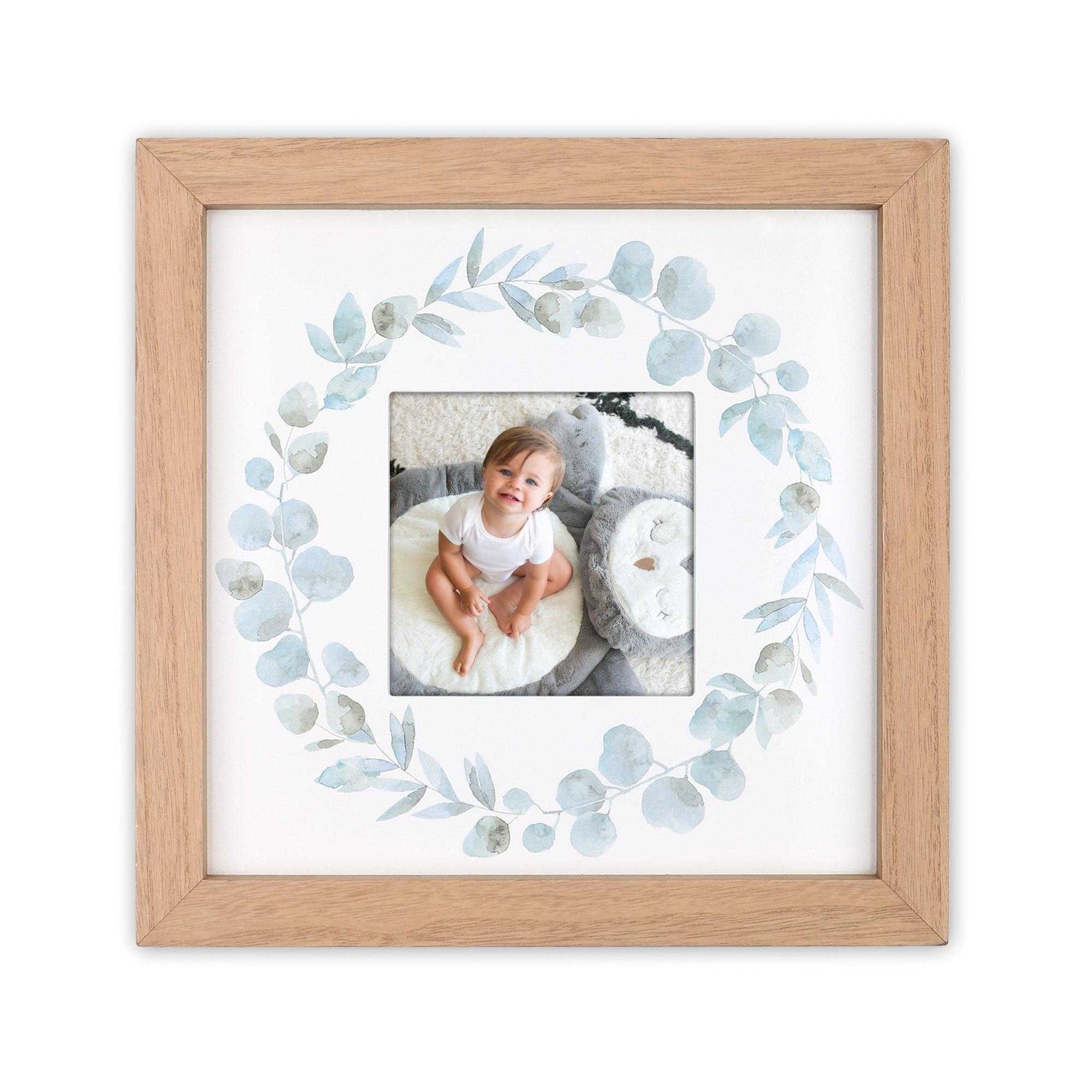 Put your favorite picture front and center in a Farmhouse Sage Leaf Wreath Picture Frame. The natural wood-toned frame has a mat with printed sage leaf design. Leaves create a sweet circle to frame your favorite photo. Includes sturdy sawtooth hanger on the back for secure wall mounting. Neutral enough for any nursery; mix and match with other pieces from the Farmhouse collection.