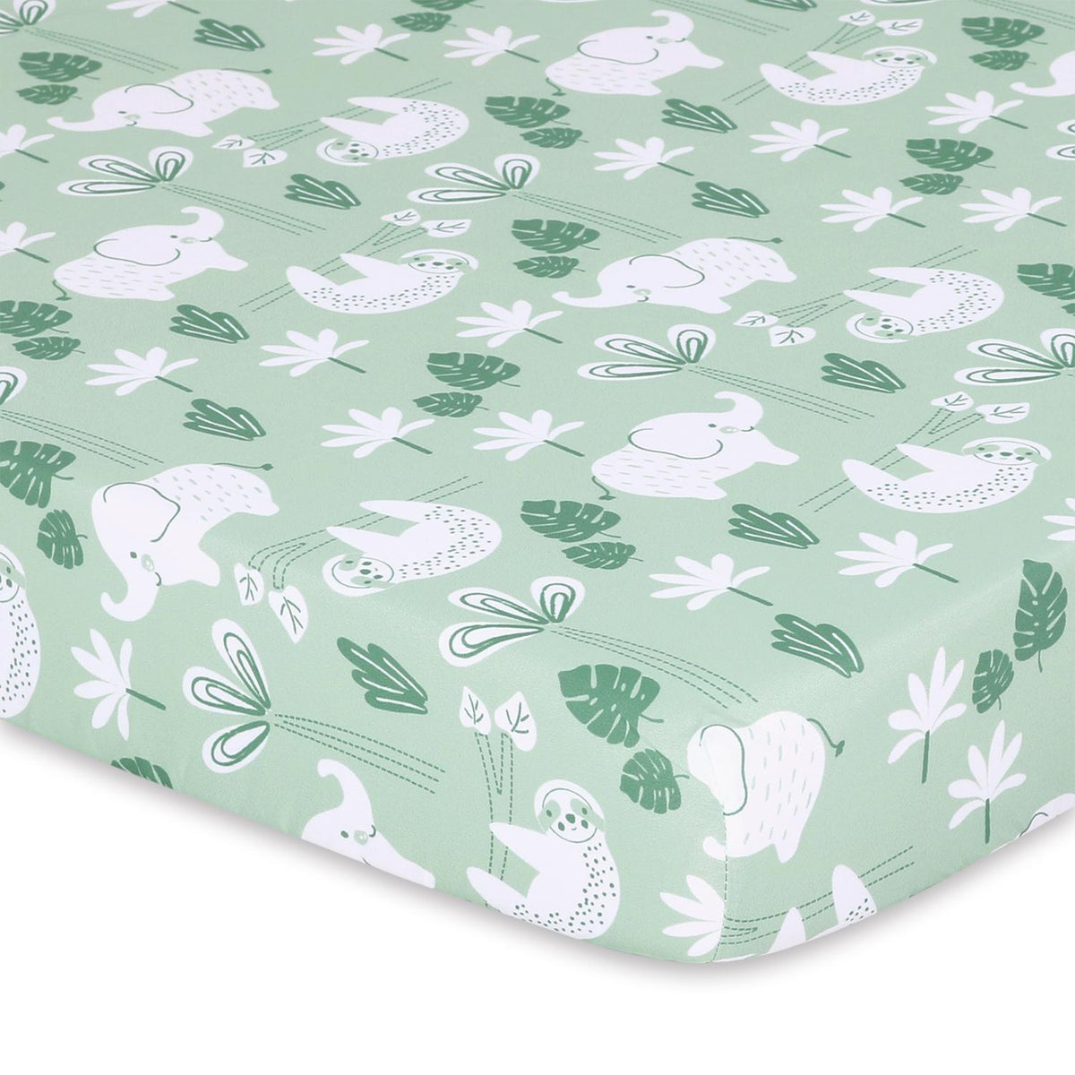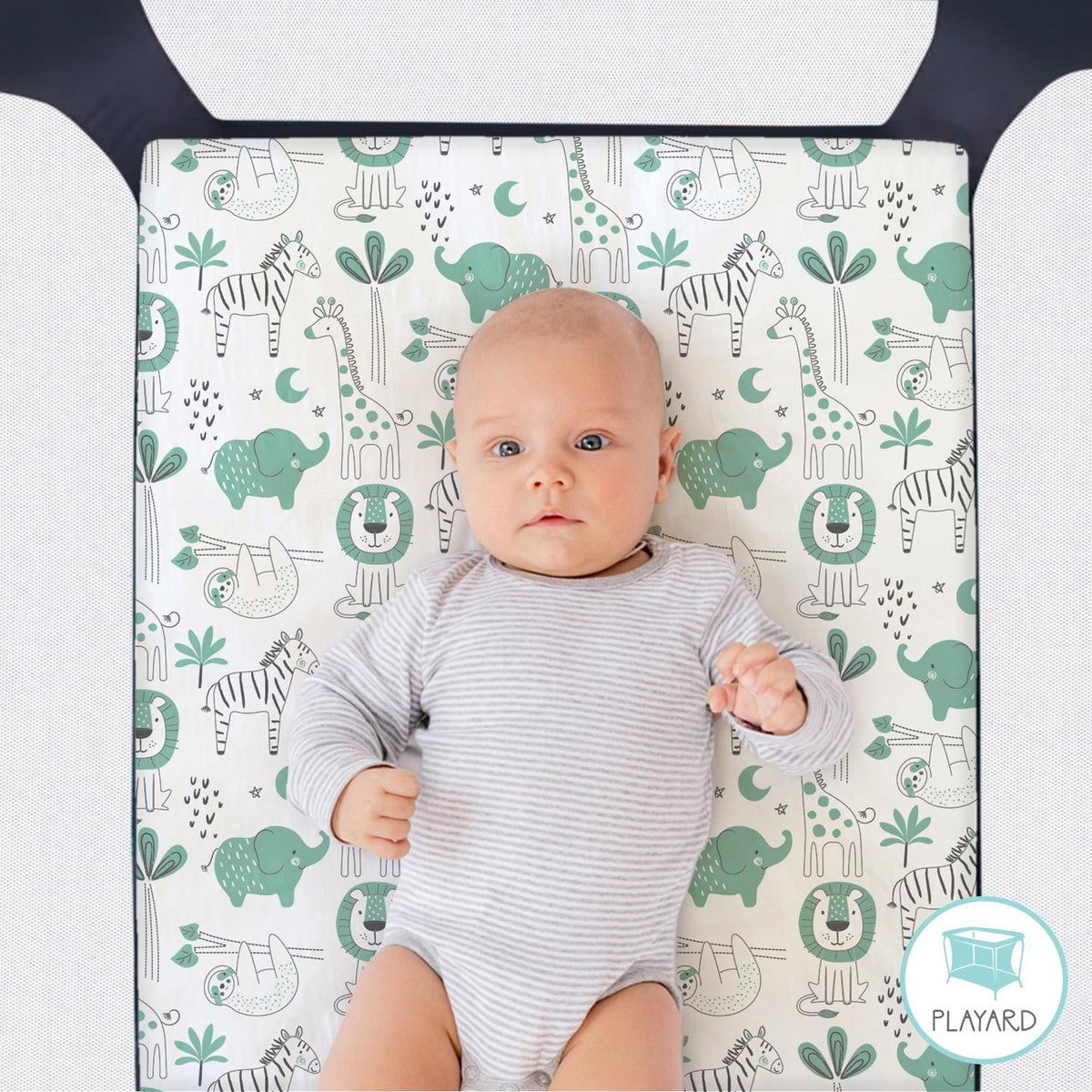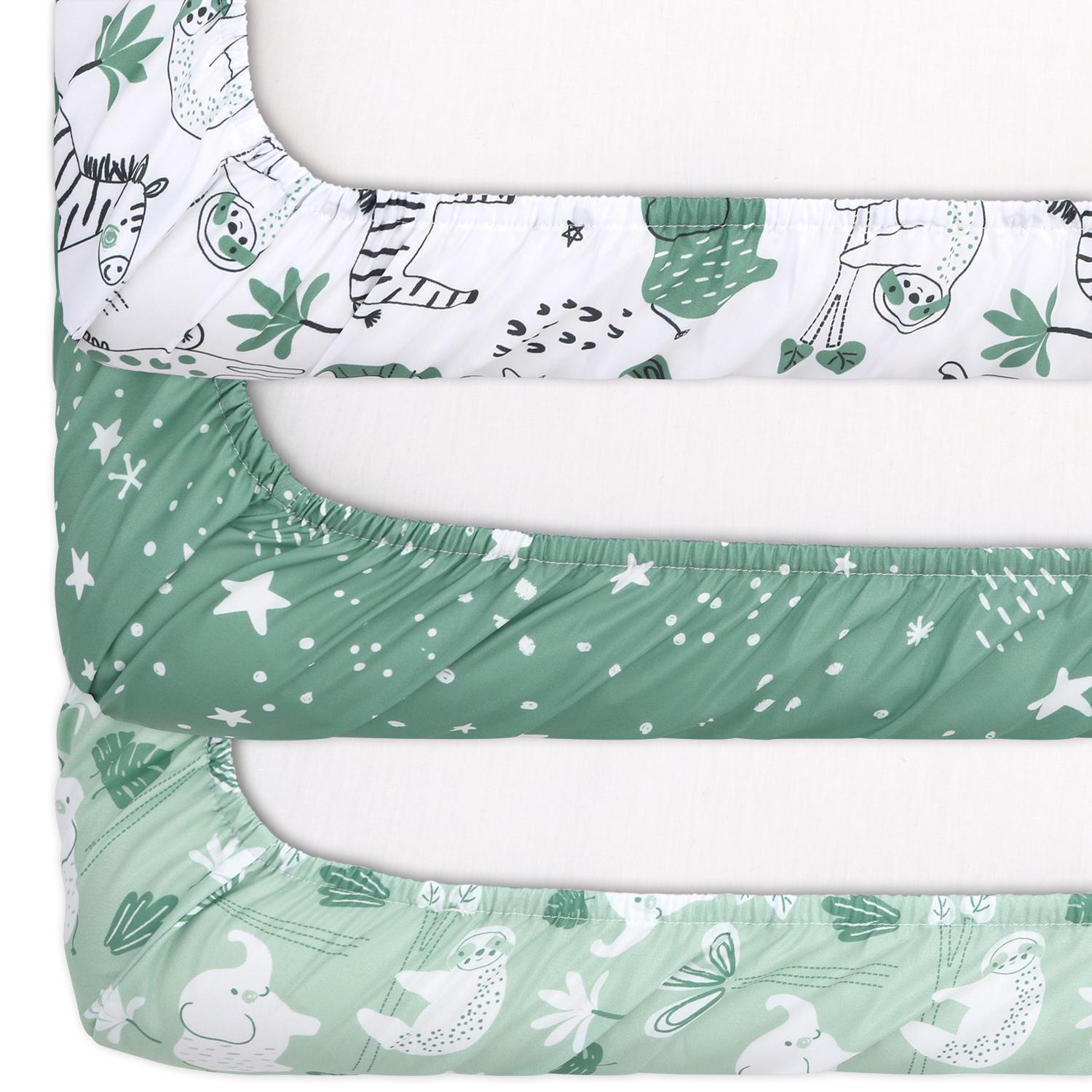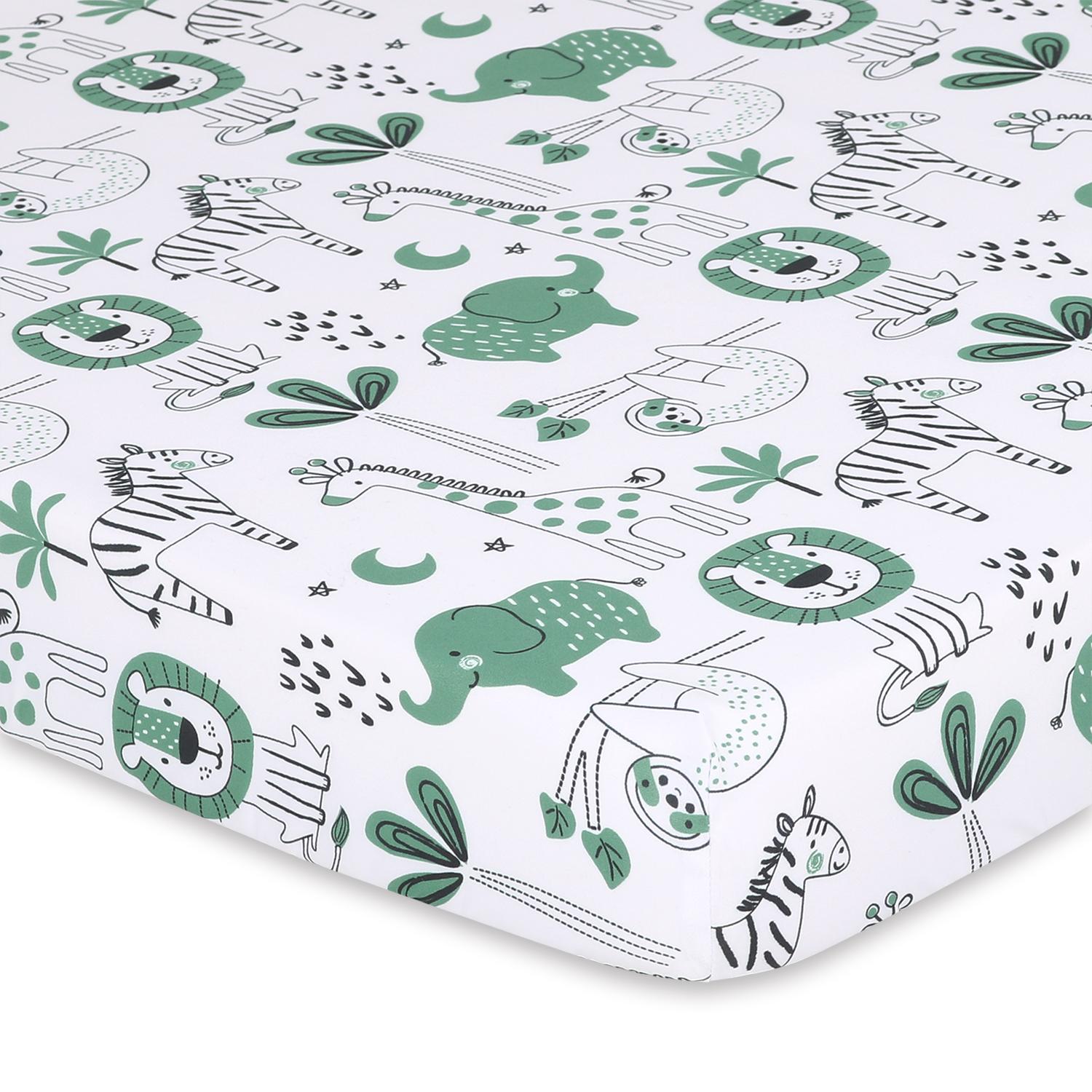 Create an adventurous and playful nursery with our Green Safari Playard Mini Crib Sheets, featuring a pack of safari animals in shades of green on a crisp white background. This safari-themed crib sheet set provides the optimal start for your baby boy or girl, adding a fun and vibrant touch to their space. The adorable safari animal prints create a lively atmosphere, perfect for both nap time and playtime.