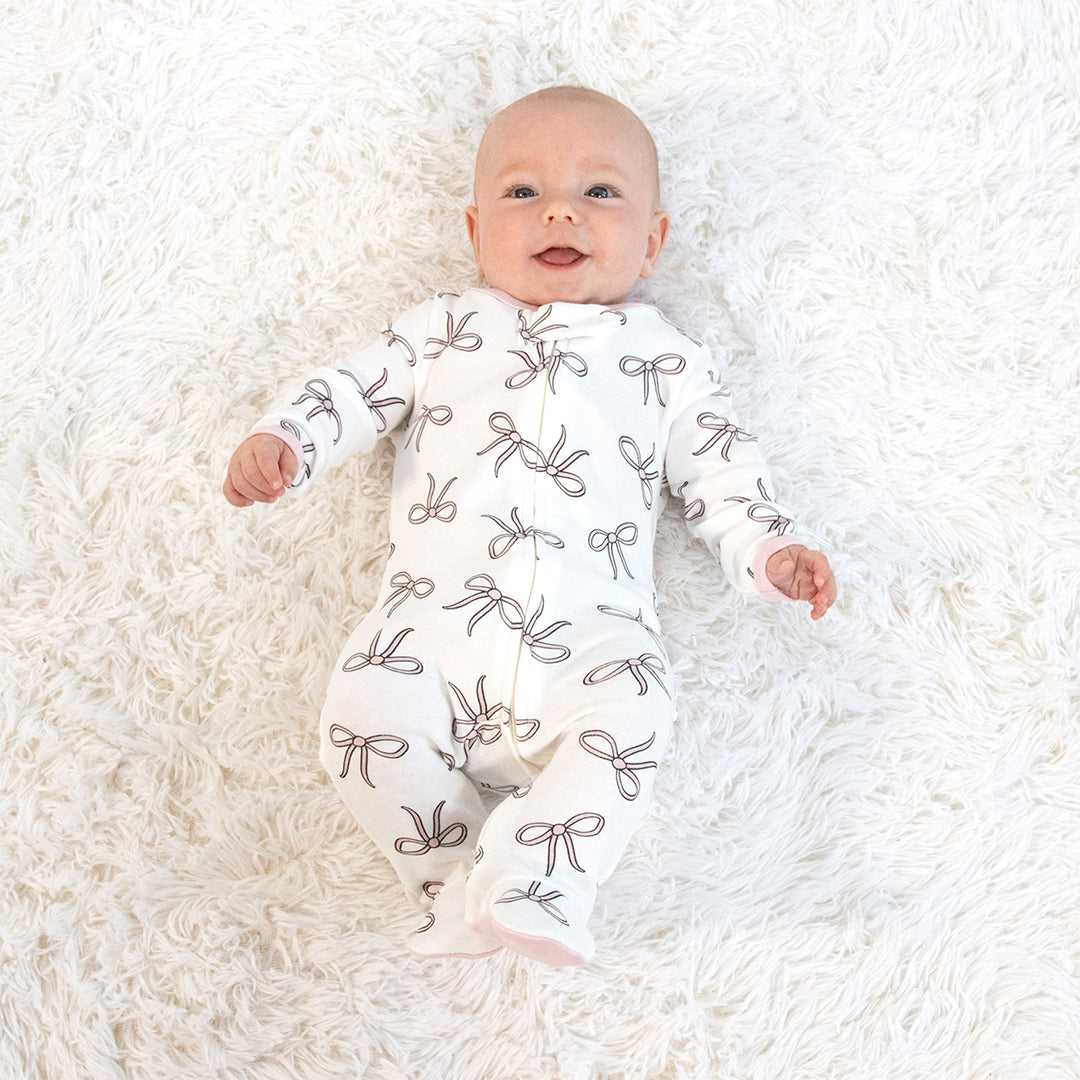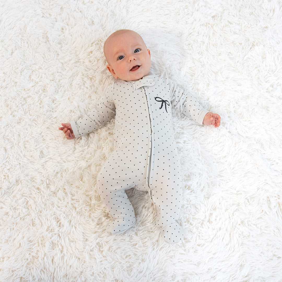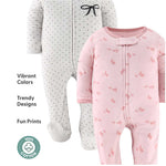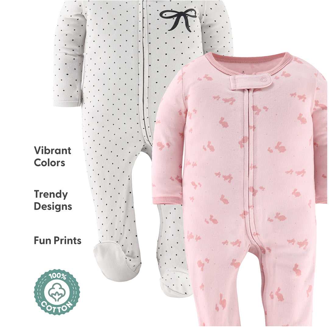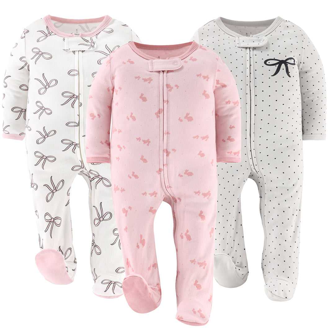 Each sleeper in this set is adorned with sweet details like pretty bows, adorable bunnies, and soft pin dots in shades of pink and light gray, adding a touch of elegance and playfulness to her daily outfits. The easy front zipper is designed with a protective cover at the neckline, helping prevent irritation and making outfit changes quick, safe, and comfortable. Crafted with durability and softness in mind, these pajamas ensure she stays comfortable through both active moments and peaceful rest, making them a delightful and practical addition to her wardrobe.
