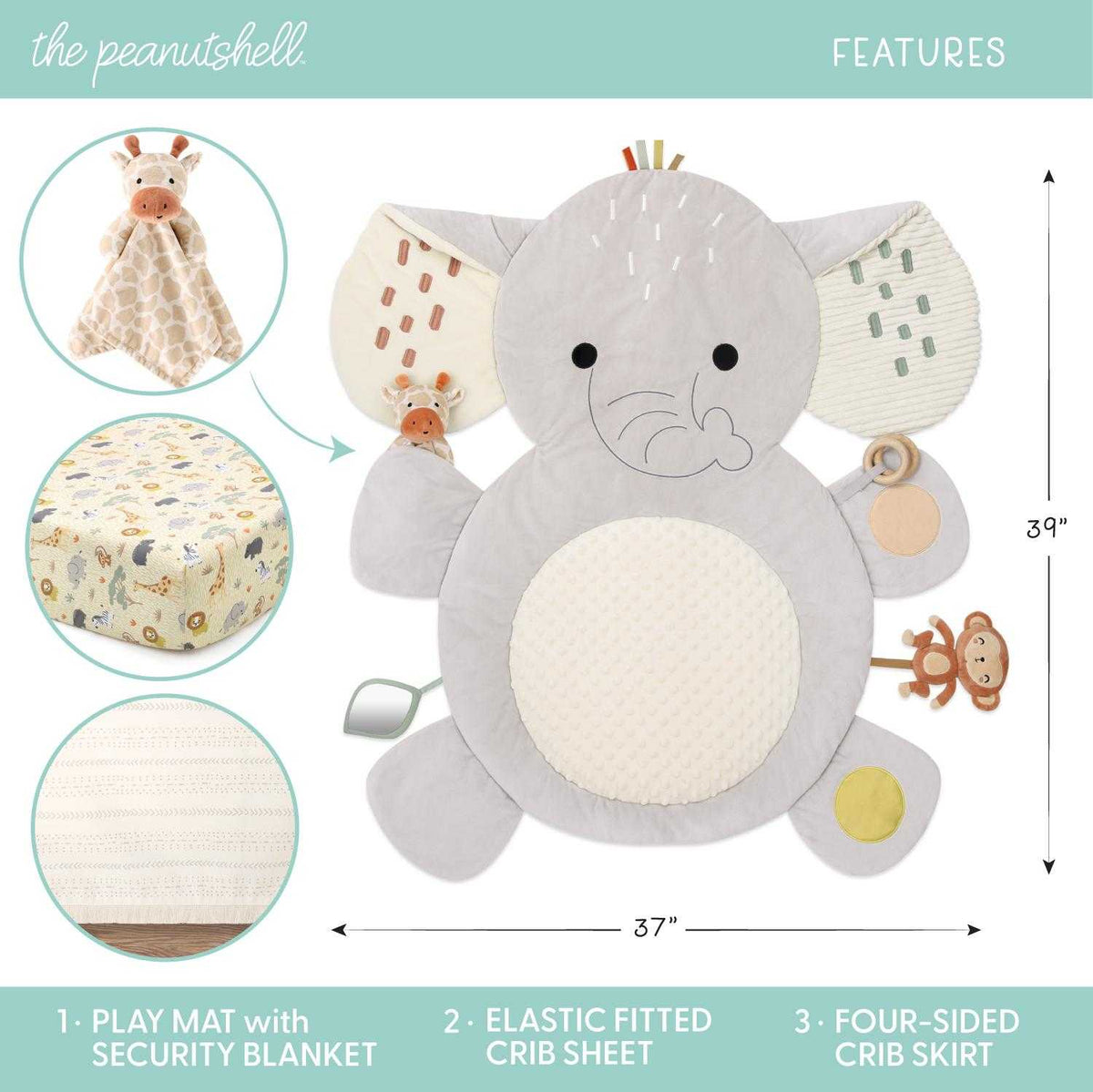 Our Elephant Safari Crib Bedding and Tummy Time Mat Set creates an engaging safari oasis for baby. This charming 4-piece set includes a generously sized elephant-shaped play mat designed for tummy time to sit up stages. With so much to discover, this playmat grows with baby and provides endless opportunities for sensory exploration, fine motor skill development, and imaginative play. The thoughtfully designed playmat features interactive activities, a non-skid backing for safety, and a cuddly giraffe security plush. This set also includes a fitted crib sheet featuring sweet safari animals, a dotted stripe crib skirt in soothing natural tones, and a matching blanket for extra coziness. Fade-resistant and machine washable for easy care, these nursery essentials make a thoughtful and practical baby shower gift.